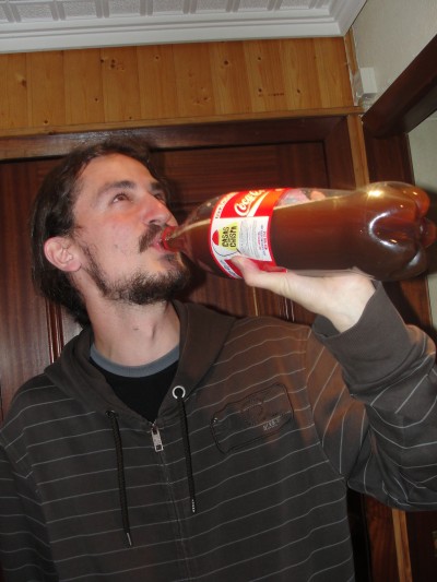 Posilnění před naší ranní procházkou - whisky, džus a cola - pro naše pohodlí všechno v jedné lahvi :-)