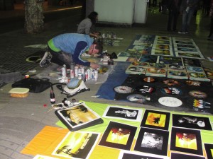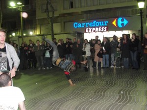 Hned první večer jsem vyšla do ulic. Bylo sice už kolem 10, ale tam to prostě žilo. Byla jsem utahaná z cesty, ale nešlo jít domů-ta atmosféra byla uplně strhující. Zašla jsem si do restaurace a dala si svoje první tapas-tohle zrovna byly brambory s uzeninou zapečený s chřestem a 2 druhy sýrů. A k tomu pivo samozřejmě:-)Po jídle jsem šla zpátky na hotel. Na La Rambla to i kolem půlnoci neskutečně žilo, všude plno pouličích umělců a prodavačů. Tak jsem se zahleděla na jedny breakdancisty (či jak:-).
