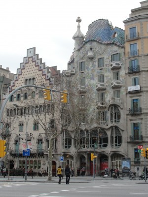 Casa Batlló-pohled z dálky. Spodek má jakoby znázorňovat sloní nohy, střecha zase ještěří hřbet