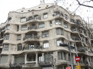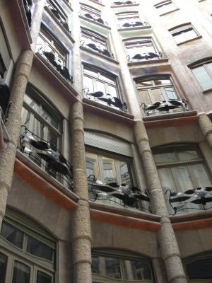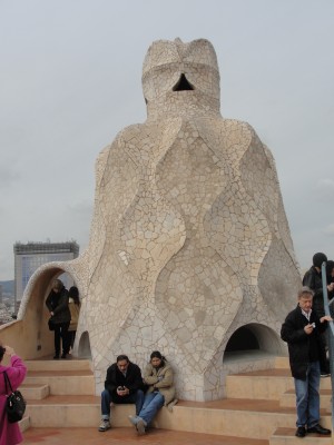 Do La Pedrery se mi už ale dostat podařilo. Studentský vstupný 6 euro. Zvenčí vypadá (zase Gaudího) stavba jakoby z kamene (odtud La Pedrera-kamenolom). Zevnitř se dá podívat do Gaudího bytu, těsně po střechou na výstavu jeho děl z oblasti užitnýho umění a na střeše, která je hodně členitá, jsou zase různý sochy absurdních tvarů.
