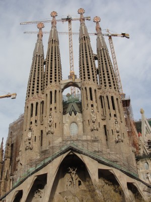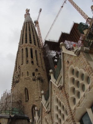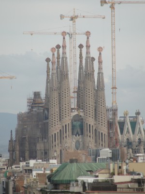 La Sagrada familia-pohled z dálky. Na stavbě se ustavičně pracuje a co jsem viděla plány výstavby(nebo spíš původní Gaudího návrhy), tak mezi těmito věžmi má být jedna ještě hodně vysoká, na jejimž vrcholku bude obrovský-odhadem asi 40metrový kříž-celková výška budovy by měla být-někdy v budoucnosti-až 170m. Přitom už teď to působí kolosálně.