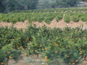 Pohled z autobusu-po levé straně moře a po pravé straně pomerančový(či mandarinkový??)plantáže občas prostřídené olivovými háji